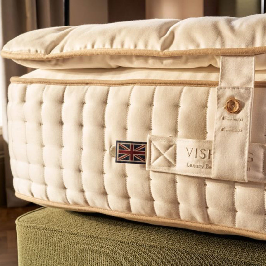 Introducing the latest addition to Vispring's mattress topper collection - the Opulence. With a thickness of 3.1 inches, the Opulence Topper offers an exceptionally indulgent layer of opulent loft and luxury. It is meticulously crafted and filled with the finest platinum-certified British fleece wool, soft-needled British wool, and sumptuous silk. This topper also boasts convenient strap attachments that elegantly secure around your mattress handles, fastening with Vispring's signature engraved wooden buttons. Each Vispring Opulence Topper is meticulously handmade in England, upholding the same exquisite traditional craftsmanship that defines our bespoke Vispring beds.